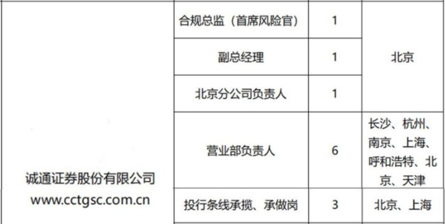 除了招募2名高级管理人员之外,诚通证券还计划引进1名北京分公司负责人、6名营业部负责人,以及3名投行业务承揽与承做岗位的专业人才。对于北京分公司负责人的职位要求,需具备5年以上的证券行业工作经验,并拥有至少3年的券商营业部负责人实战经验,同时需展现近两年可查证的良好工作业绩。营业部负责人则需拥有3年以上的券商营业部管理经验。至于承揽承做岗位,则特别强调应聘者需具备最近3年从事股权保荐相关业务的经验。